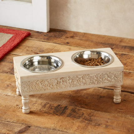 Let’s pamper those pets in style, with this Hand-Carved Solid Wood Double Pet Feeder with two removable stainless steel bowls.