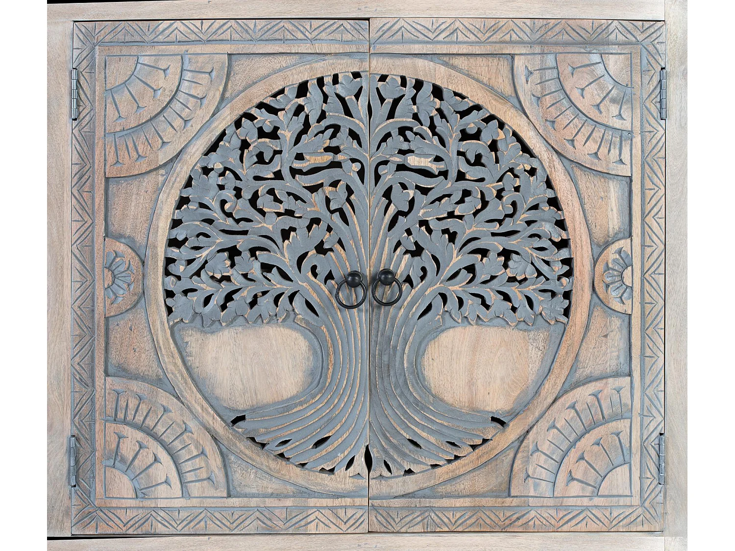Behind the four carved doors, the cabinet offers generous internal shelving that provides excellent capacity for organizing everyday essentials. Whether you need storage for dinnerware, linens, books, decorative objects, or accessories, the structured shelves make it easy to keep everything tidy and within reach. The ring-style metal handles enhance the rustic aesthetic while ensuring smooth door operation.
