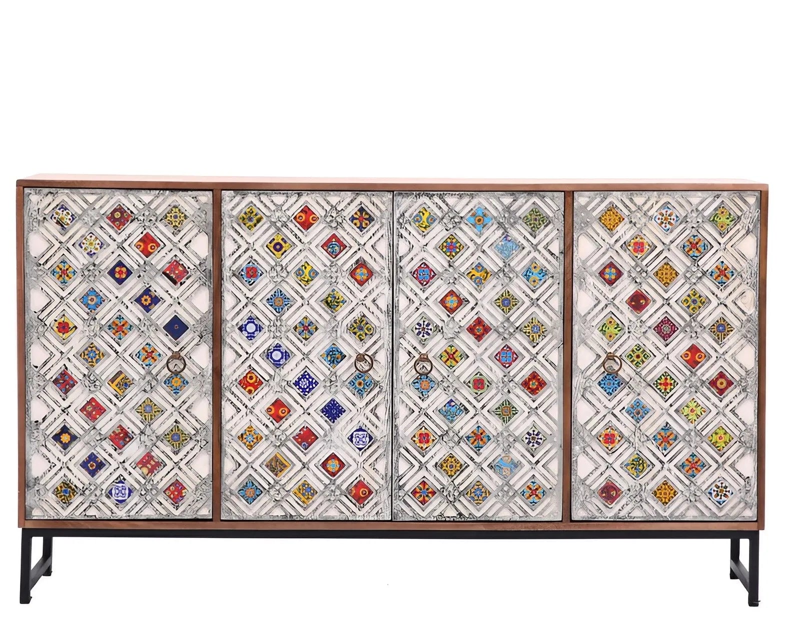 Spruce up your home decor with a dazzling touch of oriental elegance with this beautifully handcrafted classic solid wood and tile fitting Johannes Carved with Tile Fitting Sideboard. The sideboard has decorative rivets with colored tile fittings. The storage cabinet features split-tier storage cabinets hidden behind four beautiful doors. Made with natural variations of color, wood grain, and knots, this sideboard is truly one-of-a-kind. The soft antique white finish over solid wood gives it an easygoing character, perfect for any décor style. Each piece is handcrafted by artisans for an authentic, global-inspired character, making it a true work of art. With three touch-latch doors, you'll find ample storage space, with generous compartments and removable interior shelves.