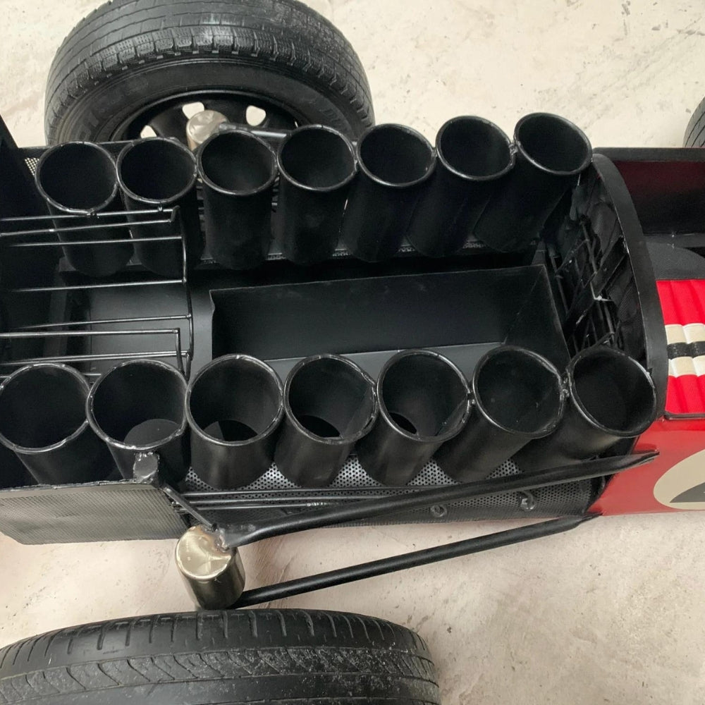 Styled after an original Ferrari racing car, this impressive fabricated metal replica will attract attention in any setting. If you’re looking for something different and trendy to store your wine bottles, then look no further! This vibrant red racing car bar sitting on original wheels has generous under-bonnet storage, a 14-bay wine bottle holder, and further storage in the engine compartment, as well as a racing seat and steering wheel for further storage.
